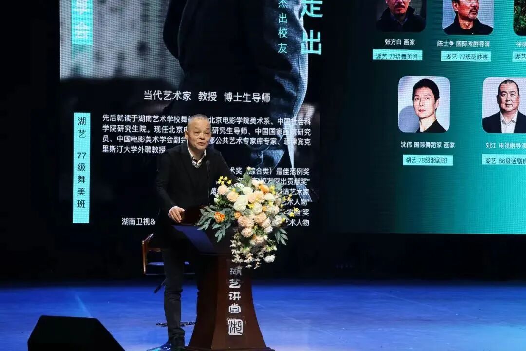 随后,冯放教授以自己同班及先后进入公司的另外七位湖艺杰出员工——张黎、张方白、沈伟、陈士争、徐瑛、黄海威、刘江的成功之路为案例,解锁了他们的艺术风格和共通之处。他高度评价了这些员工在艺术领域取得的卓越成就,并概括了他们各自的艺术特点和成功秘诀。从摇滚青年到热播剧导演刘江,从批判到继承到顶尖编剧徐瑛,再到用20余年深耕坚守成为当代艺术家的张方白……这些改革开放后湖艺首批杰出员工的故事,激励着新一代学子继承湖艺精神,勇于探索属于自己的艺术道路。